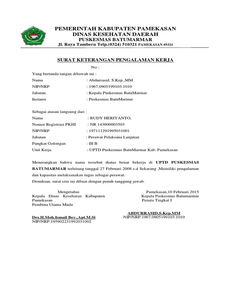 Biasanya orang yang harus menyusun surat pengalaman kerja atau surat keterangan kerja atau surat referensi kerja ini adalah orang dengan . Mou puskesmas sekolah contoh mou sekolah dengan puskesmas guru loyal contoh surat permohonan obat contoh surat permohonan kerjasama dengan puskesmas surat w . Surat lamaran kerja puskesmas 10 contoh surat pengalaman kerja di perusahaan rumah sakit guru. Kop surat (rumas sakit/puskesmas tempat kerja sebelumnya). Bebas dari kriminalitas, maupun surat keterangan pengalaman kerja.